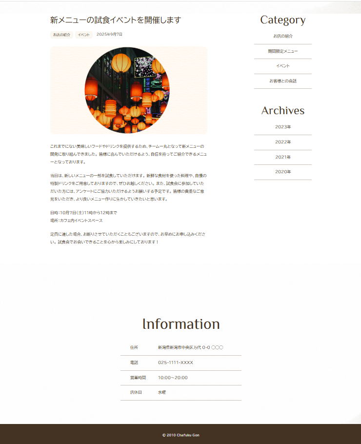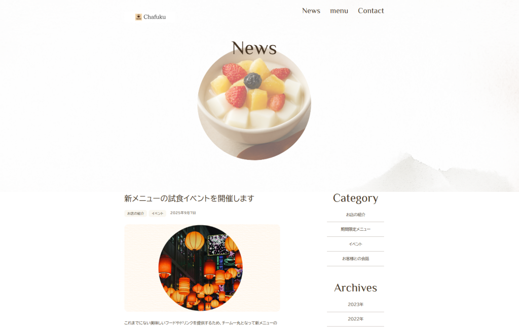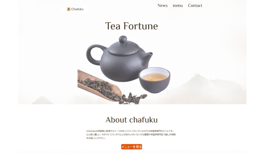 HTML/CSS HTML/CSS 2025.12.062026.01.12 Chafuku 中国茶専門店 架空ホームページ 中国茶専門店の架空ホームページです。 HTML/CSS教材を見ながら作成したサイトになります。 私の好きな中国茶専門店をイメージしてオリジナルで作成しました。 学習期間:4週間